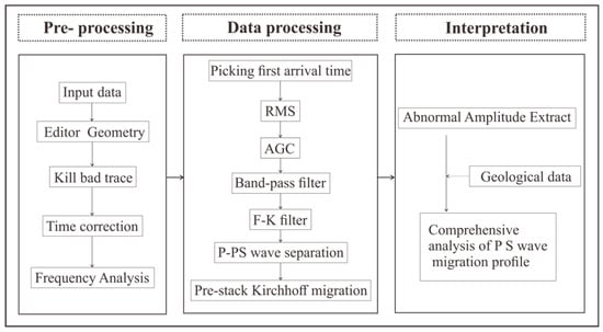 The purpose of tunnel seismic processing is to extract the reflected waves of the geological body in front of the tunnel face from the complex signals and then image them. The data processing flow is illustrated in Figure 14, including the three major steps: pre-processing, processing, and interpretation. The purpose of pre-processing is to input data and prepare it for subsequent processing. First, the seismic data are input, then the geometry is edited, and then the bad trace of seismic data is eliminated. In a few cases, the instrument triggers a delay, and the time correction can be used to correct the data. Spectrum analysis is used to display the spectrum of the raw data. Processing is mainly used to extract and image the effective wave-field. We selected first arrival time of seismic wave to calculate the direct wave velocity. The Root Mean Square (RMS) is used to equalize the amplitude of the seismic profile. Since the seismic wave is a spherical wave, the energy decays exponentially with the propagation time. Therefore, the Automatic Gain Control (AGC) is used to recover the bottom data amplitude. The band-pass filter is used to filter out the surface waves, acoustic waves, and some other noise signals in the tunnel. One fundamental difference between tunnel seismic data processing and conventional oil seismic data processing is that seismic waves propagate in full space in the tunnel seismic, whereas they propagate in half space for oil seismic waves. This leads to a significant increase in the difficulty in data processing. The F-K (where F is frequency, K is wave-number) filter can be applied to transform the seismic signal from the time domain to the frequency wave-number domain to extract the reflected signal from the advanced tunnel face []. The P- and S-waves are separated from the three-component VSP data via the wave separation method []. The three-component seismic data is further separated into P, Sh, and Sv waves. The pre-stack Kirchhoff migration is applied after separation to image the P, Sh, and Sv waves. The tunnel seismic interpretation method is also different from that of the conventional oil seismic method. The tunnel seismic detects the medium in front of the face, so the direction of the seismic waves’ propagation is parallel to the layered medium rather than perpendicular to the layered medium. Therefore, identifying distinctive layer boundaries is difficult, even in the migration profile. Extraction from the anomalous amplitude on the migration profile is recommended to interpret the data. Normally, a combination of the geological data and P wave, Sh wave, and Sv wave migration profiles is needed to analyze the geological conditions in front of the tunnel face.