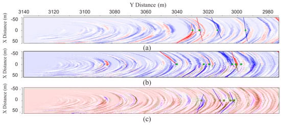 Seismic migration profile where X is the tunnel excavation direction and Y is the vertical direction: (a) P wave, (b) Sh wave, and (c) Sv wave.