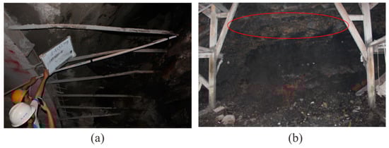 The seismic migration profile is shown in Figure 15. Through the amplitude anomaly attribute extraction from Figure 15, the P-wave and both the Sh and Sv waves encountered several large impedance differences between the mileage at K3 + 030 and K3 + 005, where a few of the strongest magnitudes of colors existed. Combined with the geological conditions, we speculated that the region is relatively heterogeneous and fragmented, with possible goafs. Our conclusion for the excavation is as follows: an old tunnel for mining was exposed at K3 + 024.5 (Figure 16a). The old tunnel almost traversed the face of the new tunnel, and the mileage difference from the intersection of the left and right side of the walls of the new tunnel was about 1 m. The width and height of the old tunnel were about 1.2 m and 1.5 m, respectively. The bottom of the old tunnel was almost parallel to the new tunnel floor, which was 6 m higher than the new tunnel. The bottom medium of the old tunnel was alternately composed of layers of thin coal and rock layers. At K3 + 021, there was a goaf (red line in Figure 16b) located 1.7 m above the tunnel floor with a layer thickness of 1.2 m. This was backfilled with vermiculite and had a breccia-like loose structure with extremely poor stability. K3 + 019–018 was mainly composed of shale, with a coal seam and vermiculite backfill. The vault part of this section was extremely broken. The K3 + 018–009 section was a strongly weathered carbonaceous shale with a loose structure that was extremely broken with poor stability. The homogeneity and integrity of the surrounding rock gradually became better after K3 + 006.
