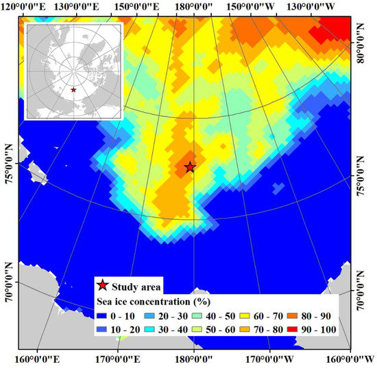 Location of our study area and surrounding sea ice condition on August 14, 2017 retrieved from the daily sea ice concentration data from Special Sensor Microwave Imager/Sounder (SSMIS) passive microwave data [34].