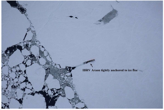 Aerial view of the sea ice floes where the field investigation was carried out on 13–15 August 2017, with the support of the icebreaking research vessel (IBRV) Araon, which was firmly anchored to the main ice. The photograph was taken by helicopter at an altitude of about 2285 m.