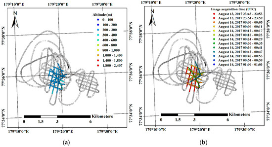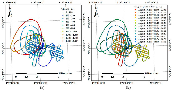 Helicopter-borne VHR image acquisition results: (a) locations and altitudes of image acquisition; and (b) corresponding image acquisition date and time, expressed as hh:mm.
