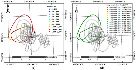 Predefined subsets of acquired VHR images: (a) locations and altitudes; and (b) acquisition times of the selected images acquired from altitude ranges between 200 and 400 m, designated as Subset I; (c) locations and altitudes; and (d) acquisition times of the selected images acquired from altitudes higher than 1000 m, designated as Subset II.