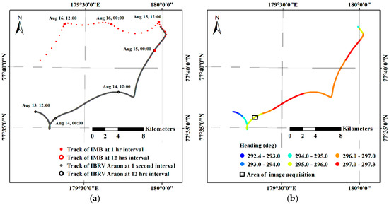 The drift record from the IBRV Araon was investigated to compensate for the effect of continuously drifting sea ice (Figure 5). Before applying the time interpolation to the lower-resolution drift records from the ship, the linearity of the drift trajectory was investigated using the heading direction to select a proper interpolation method (Figure 5b,d). During the period of the whole image acquisition, the heading directions of the ship recorded by internal 1 Hz logger showed very low variation, which was evaluated as ±0.0004° (Figure 5d). Thus, we assumed that the main ice drifted without rotation during the period of the image subsets acquisition.