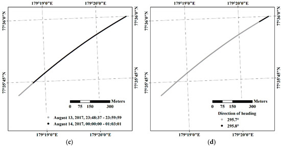 Trajectory of the main ice in the study area: (a) an overview of the tracking record from 13 August to 16 August 2017; (b) heading information of the IBRV Araon while anchored to the main ice; (c) detailed tracking record from the IBRV Araon during the helicopter-borne image acquisition; and (d) detailed heading information of the IBRV Araon during the helicopter-borne image acquisition.