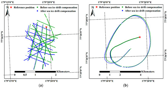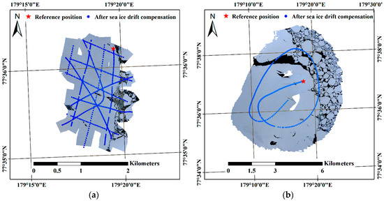 Compensation for the effect of sea ice drift in the helicopter-borne VHR images: (a) the imaging locations of Subset I before and after the compensation; and (b) the imaging locations of Subset II before and after the compensation.