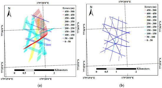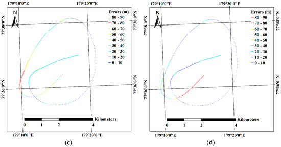 Quality assessment of the imaging locations during the mosaicking processes: (a) errors estimated from the imaging locations of Subset I before the sea ice drift compensation; and (b) after the sea ice drift compensation; and (c) errors estimated from the imaging locations of Subset II before the sea ice drift compensation; and (d) after the sea ice drift compensation.