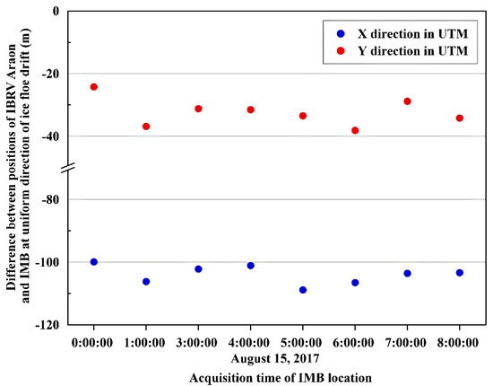 The usability of the IMB trajectory by combining it with the ship trajectory was assessed by evaluating positional consistency between the two trajectories. The positional difference in the geographic coordinates between the buoy and the ship is maintained as a constant value when the ice floe drifts without rotation. Trajectories recorded at the same time with identical heading direction, i.e., 297.3°, were acquired from 00:00 to 08:00 on 14 August every hour, except for the record at 02:00, when the ship headed to a slightly different direction angle. The selected trajectory records with the identical heading direction varied by ±1.1 m along the X direction and by ±1.6 m along the Y direction (Figure 10). From these results of the assessment of the positional consistency, the continuity of the two trajectories was shown as being maintained from consistent placement of the two logging locations with small variations from intrinsic geolocation errors of the built-in GPS receivers.