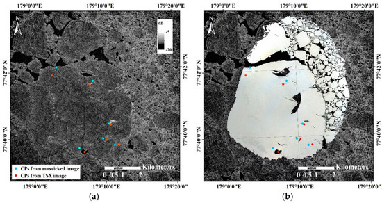 To test the feasibility of the helicopter-borne mosaicked VHR image for the calibration or validation of lower-resolution remote sensing data, consistency in shape and geographic matching of the main ice included in the mosaicked VHR image with the TSX SAR image was assessed using similarity transformation [47]. The similarity transformation assumes that the shape of an object does not change and considers a combination of translation, rotation and scaling so as to be matched with another object. For applying the similarity transformation, control points were manually and carefully selected from features located inside the main ice. Consequently, the control points were located to avoid regions vulnerable to surface melting or deformation from collisions with other ice floes such as the boundary of the ice floe.
