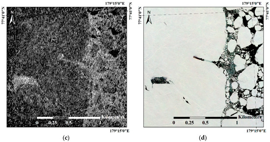 Although the rotation of the ice floe after the imaging period was not considered, precise registration was fulfilled using a few control points and the similarity transformation with the mosaicked image which was proximally located to the same ice floe in the SAR image by the translation using the combined trajectories of the IBRV Araon and the IMB. In the zoomed area around the IBRV Araon not showing gaps in the mosaicked VHR image (Figure 11c,d), detailed sea ice surface structure, e.g., flat ice surface and pressure ridge, and surface composition, e.g., ice and water, observable in the mosaicked VHR image were directly comparable with the backscatter of the SAR image. The surface characteristics of sea ice can be further studied by comparing both images and can be applied into the calibration or validation of satellite remote sensing-based sea ice products.