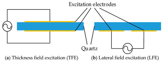 There are two different QCM structures: thickness field excitation QCM (TFE-QCM) and lateral field excitation QCM (LFE-QCM), as shown in the Figure 1. The piezoelectric bulk acoustic wave sensor of the lateral field excitation mode has different electrode structures in addition to the thickness field excitation sensor, and its two electrodes are on the same principal plane of the crystal substrate. This kind of electrode structure enables the electrical field to penetrate into the liquid. Therefore, LFE-QCM has extremely high sensitivity to electrical properties in the liquid, and the mechanical properties similar to the TFE sensor [,,,]. At present, many studies have been completed on LFE-QCM, which has been shown to have many advantages over traditional QCM in practical applications. The study of the lateral field excitation electrode gap by Hu et al. proved that the wider the gap, the lower the sensitivity to the solution properties, and has the greater electric field penetration into the liquid when the sensing layer is completely exposed []. Abe et al. confirmed this finding. A lateral field excitation QCM with a metal film on the sensing layer was designed []. This QCM could not detect the electrical properties of the solution when compared with the ordinary lateral field excitation QCM.