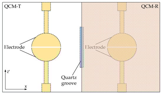 The two resonant elements of the dual channel LFE-QCM are, respectively, QCM-T (test) resonant element and QCM-R (reference) resonant elements. Both resonant elements adopt the lateral field excitation mode, and the metal excitation electrodes are all on the same side. There are many kinds of lateral field excitation electrode geometry, such as the semicircular, half-moon, and T structures. Different electrode structures have different sensitivities to the frequency response. According to the research, the excitation electrode of the half-moon structure is the most sensitive and excited electrode for detection. The best sensitivity occurs when the electrode gap is parallel to the x-axis of the quartz crystal [,,]. Therefore, we chose the half-moon structure and the gap was designed parallel to the x-axis.