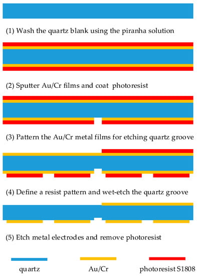 The separate AT-cut quartz crystal chip used in this study was designed in a rectangular shape with dimensions of 13.5 mm × 8 mm. The starting blank was 40 mm × 40 mm, and 100 μm thick with double polished planar faces. The fundamental frequency of the QCM resonator was about 16 MHz. The metal excitation electrode had a half-moon structure with a radius of 1.25 mm. Both the metal excitation electrode and the metal film were composed of an Au/Cr double-layer metal film, and gold film was used as a main electrode and a thin chromium film as an adhesion layer between the quartz and the gold film. The quartz groove was 3 mm × 50 μm and 20 μm deep. Five single dual-channel QCM chips could be cut out from one quartz blank. All quartz blanks were processed with the quartz wet etching process, and Figure 3 depicts the process diagram. (1) The quartz blank was washed using piranha solution (H2SO4:H2O2 = 3:1); (2) Au/Cr bi-layer films were sputtered on both sides of the quartz blank, followed by the photoresist coating; (3) the Au/Cr bi-layer films on the area of quartz groove were patterned for etching the quartz groove; (4) a resist pattern was formed on both sides of the blank, followed by wet-etching the quartz groove using a saturated ammonium bifluoride solution at 85 °C; (5) then, the Au/Cr bi-layer films were etched to form electrodes and the photoresist was removed, followed by dicing the quartz blank.