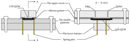 During installation, a quartz blank was first placed in the rectangular recess in the center of the middle platform, and both long sides of the rectangular recess had two electrode access apertures. The side of the quartz blank with the excitation electrode was close to the middle platform, and the other side with the floating metal electrode was connected upward to the upper cover and the silicone gasket. The depth of the rectangular recess ensured the degree of the tightness and reduced the high mechanical strength of the PMMA material itself to the quartz blank. The upper cover had a sample inlet and an outlet with plastic hollow hoses to facilitate the connection of the syringe to allow the solution to circulate. Four small holes corresponded to the electrode access apertures in the lower bottom to lead out the electrodes. The electrodes were extracted using contact spring pins to avoid damaging to the quartz blank or electrode using conventional welding methods, which was beneficial to the reusability of the flow cell.