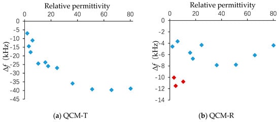 Figure 6 shows the relationship between the measured frequency shift Δf and the permittivity. Δf is the fundamental frequency in air minus the resonant frequency in the liquid at room temperature (25 °C). The frequency shift of QCM-T generally shows a certain trend, but several solutions differ from the frequency shift of the adjacent solution. The measured frequency shift of the QCM-R was proportional to the square of the product of the viscosity and density. By carefully comparing the two figures, the deviation point occurred in several solutions where the QCM-R resonator was most sensitive to the viscosity. The points marked with red in Figure 6b are methyloleate, dibutyl sebacate, and 1-octanol. The viscosity of these three solutions was five times more than the viscosity of water, so the frequency shift was higher than that of the other solutions. The frequency difference caused by the simple permittivity could be obtained by subtracting the frequency difference of the QCM-R resonator from the frequency difference of the QCM-T resonator in the same solution.