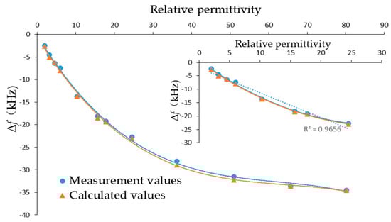 Measurement and calculated frequency shift caused by relative permittivity.
