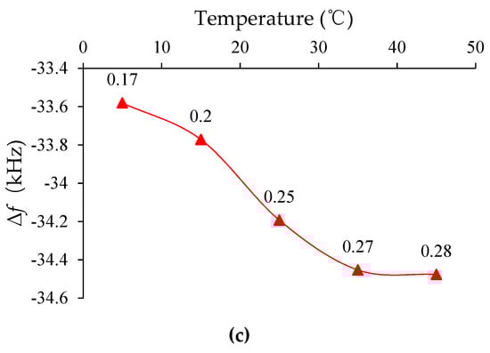 However, Figure 8c shows the frequency shift caused by the conductivity alone when the frequency shift between the two resonant elements was subtracted. The frequency shift caused by the conductivity showed a monotonous change with the increase in temperature. Due to the low solubility of NaCl, the content of conductive ions was less. When the temperature rose to 40 °C, the conductivity change was no longer obvious compared with the low temperature, accompanied by a slower frequency shift. The variation pattern also matched the numbers provided in Figure 8c, which were the conductivity values measured using a portable conductivity meter. The conductivity value had a good linear relationship with the frequency shift, which was also consistent with the linear relationship exhibited by the QCM in the low concentration conductivity solution in the literature [,]. Therefore, this experiment also proved that the temperature effect had a considerable influence on the measurement of the electrical properties of QCM, and it was not possible to simply neglect the influence of the liquid viscosity and density during the measurement in the liquid.