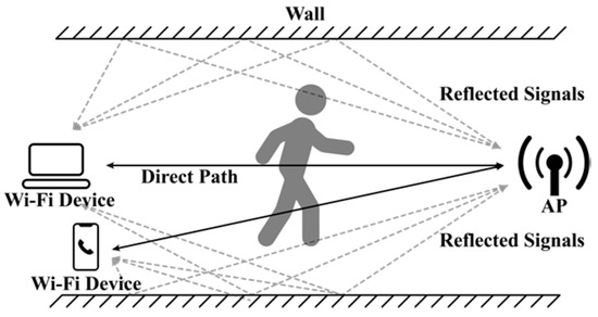 As Wi-Fi signals propagate in physical space, the signals reach receivers (Wi-Fi devices) through various routes, a concept known as multipath. Figure 1 shows the multipath of signal propagation: The received signal is composed of signals arriving over many different paths, all which can be affected by environmental factors [3]. The environmental factors therefore combine with scattering, fading, and power decay over distances, and these environmental effects on the signals can be manifested in the CSI [18]. For example, while CSI remains stable in a static home environment, if a person performs activities, Wi-Fi signals scatter in response to the body’s movement, thereby causing bistatic Doppler shift at the receiver. The bistatic Doppler frequency depends on the occupant’s moving speed, the Wi-Fi frequency band, and the relative position between the occupant and the Wi-Fi transceivers [32].