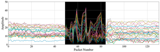 Figure 2 shows the raw CSI amplitude data of 30 subcarriers for a walking activity. The different colors indicate 30 subcarriers that have different amplitude values but show a similar tendency. When a subject is standing, the CSI is relatively stable. However, the amplitudes fluctuate as the subject starts to walk. The black area in Figure 2—which indicates when the walking activity occurred—has relatively high amplitude variance. CSI-based ADL-recognition approaches exploit such CSI pattern changes [18] to identify human activity.