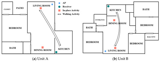 The other contributing factor is the difference of population densities. Just as people can access home networks from outside their walls, people outside of a house can affect the Wi-Fi network environment inside. Thus, neighbors’ activities or outdoor movements will conceivably affect the performance of CSI-based ADL-recognition systems. Unit B had more nearby units than Unit A. Significantly, for Unit B, neighboring households shared walls on both sides of the apartment, whereas Unit A only had neighbors five meters away on one side of the testbed. Also, the elevator located next to Unit B continuously ran, which influenced the signals within Unit B; Unit A had no elevator. Thus, more movements unrelated to the test activities took place in proximity to Unit B, which could affect the received signals used for activity detection. Unit B was in a higher population apartment complex than Unit A testbed, meaning that there were more Wi-Fi networks around to influence the test. Thus, the surrounding Wi-Fi signals had a higher chance to interfere with the testing Wi-Fi signals in Unit B than Unit A. However, as mentioned in the previous section, such interference from surrounding Wi-Fi signals might have been alleviated by the building materials of Unit B, although Unit B had many openings.