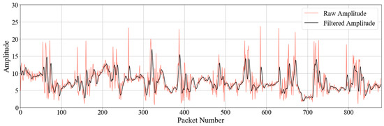 The raw CSI data contains high frequency noise, outliers, and artifacts introduced by rate adaptation rather than by human activities—high frequency noise manifests when the radios are switched to different modulation and coding schemes. Thus, a second-order, low-pass Butterworth filter was used to remove high frequency noise from the raw CSI data. The filter was configured to keep the sampling rate at 10 packets/s, and the cut-off frequency was set at 1 Hz. Although the walking activity causes higher Doppler shift than 1 Hz, the phase shift caused by occupant’s activity would be rotated due to hardware imperfection. Thus, the 1 Hz filtered CSI still contained the variation caused by walking activity. The variation in the filtered CSI was distinguished from other activities [15]. Figure 4 shows the raw and filtered amplitude data of one subcarrier. The filtered data became smooth after the high-frequency noise reduction.