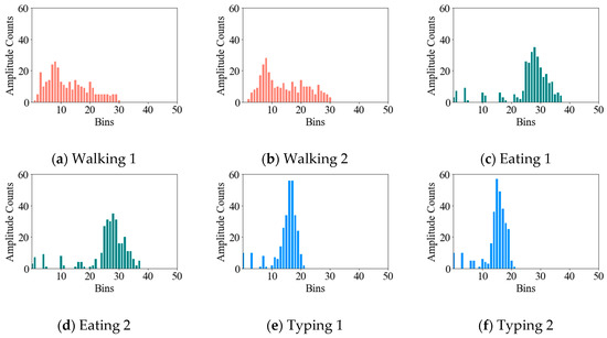 Unlike an SVM, an EMD finds the minimum cost of matching one distribution into another and thereby represents to what extent two distributions are similar to each other. Notably, under EMD, the same activity will have similar distributions across the CSI amplitudes, whereas different activities will have distinctive distributions. Figure 5 shows a histogram of the CSI distributions across all 30 amplitude subcarriers; here, “Bin” refers to the range of amplitudes, and “Amplitude Count” refers to the number of times the corresponding amplitudes appear in each Bin. In order to recognize activities, a known CSI-amplitude distribution for each activity needs to be selected; in this study, we selected three known distributions for walking, eating, and typing. Then, the EMD algorithm [33] was employed to calculate the EMD between the known distribution for the labeled activities and the unknown distribution for the unlabeled activities. If the EMD of an unknown activity manifested a minimal distance to one of the three known activity distributions, the unknown activity received a label for the corresponding activity.
