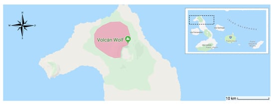 The existence of the new iguana species was reported to Science in 2009 [5]. Since then, pink iguana rapidly became a flagship species, internationally recognized in Science, Arts, and Society [6]. The species, which has substantial evolutionary legacy [7]), is endemic to Wolf Volcano on the Isabela island (Galápagos, Ecuador), at altitudes ranging from 600–1700 m asl. It lives in syntopy with a population of C. subcristatus, another endemic species of iguana, and the two species do not hybridize. There are several issues that threaten the existence of pink iguanas. These include the small population size (census ; ), the limited area of distribution (less than 25 ) depicted in Figure 1, the possible competition with syntopic species, and finally the presence of introduced predators (feral cats and black rats). In 2012, this species was included in the International Union for Conservation of Nature (IUCN) Red List, under the category Critically Endangered [8].