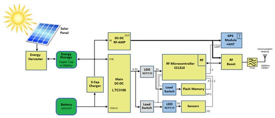 - The energy harvesting and power architecture solution, that enables long distance communication by powering both an high current demanding RF booster and the energy demanding GPS module;