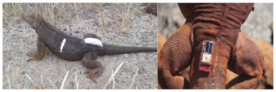 - Goodman, R.M.; Knapp, C.R.; Bradley, K.A.; Gerber, G.P.; Alberts, A.C. Review of radio transmitter attachment methods for West Indian rock iguanas (genus Cyclura). Appl. Herpetol. 2009, 6, 151–170. [Google Scholar] [CrossRef]