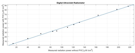 The digital ultraviolet radiometer has been used to measure the transmission of light in the UVB band of PVC during exposure to sunlight. Measurements were performed in sunny days in Rome at a latitude of approximately North. It is worth to consider that Galapagos islands are close to the equator with a latitude of about . Figure 6 shows the power intensity (W/m) measured exposing the ultraviolet radiometer to the direct sunlight versus the power intensity measured behind the PVC case. Different intensities correspond to different hours of the day.