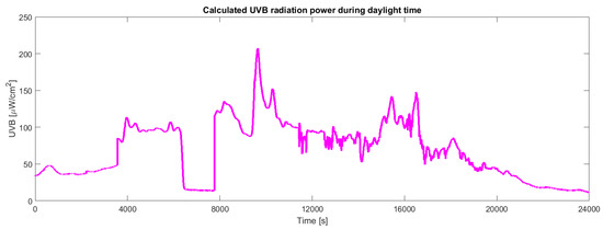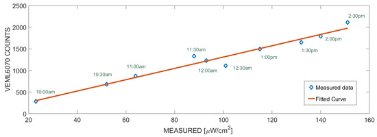 The VEML6070 UV light sensor has been calibrated with respect to the UVB intensity measured by the ultraviolet radiometer. For the scope, the sensor and the ultraviolet radiometer have been exposed to the sunlight. Results show a good reproducibility at different intensities of sunlight and at different weather conditions. Figure 7 shows the calibration data fitted by a straight line. The linear fit achieved . The UVB intensity has been estimated from the calibration curve. Figure 8 shows the behaviour of the intensity of UVB radiation in a partly cloudy day. Samples have been collected every 2 s during a typical partly cloudy day starting from 10:00 to 16:40.