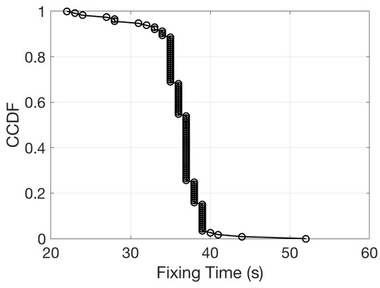 Complementary cumulative distribution function of the time to obtain the first fix from the GPS unit.