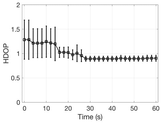 After the first fix, the accuracy of the position increases. The accuracy is measured by the HDOP parameter (Horizontal Dilution of Precision) [20] which is embedded in the NMEA message. In Figure 14 the value of the HDOP found in the tests is plotted as a function of the time from the first fix. A value of HDOP less than 1 is associated to the highest possible confidence level of the position estimation. The average of the HDOP after the first fix is only slightly larger than 1, however the wide dispersion in the parameter makes the first fix scarcely reliable. After 30 s from the first fix the mean value of the HDOP converges to 0.8 with a negligible dispersion.