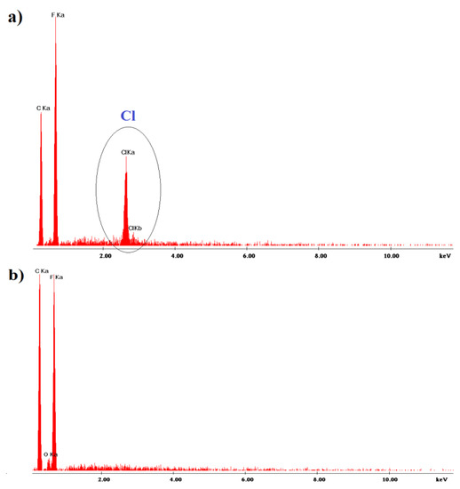 SEM/EDS analysis was conducted to investigate the change in the chemical composition of the membranes and the extent of substitution of the native chlorides to invited bicarbonates. Measurements were performed for a non-conditioned polystyrene membrane (Figure 1a) and for this membrane after conditioning in 10−1 mol L−1 NaHCO3 (Figure 1b). The EDS results indicate apparent replacement of chloride ions from lipophilic sites in the polystyrene membrane.