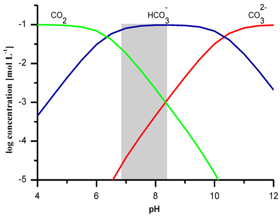 where: K1 (pK1 = 6.35) and K2 (pK2 = 10.33)—dissociation constants of carbonic acid at a temperature of 25 °C [20], —activity of the hydrogen ion, —total concentration of NaHCO3. Activity coefficients were calculated using the Debye-Hückel equation. The measured pH values were used in the calculations.