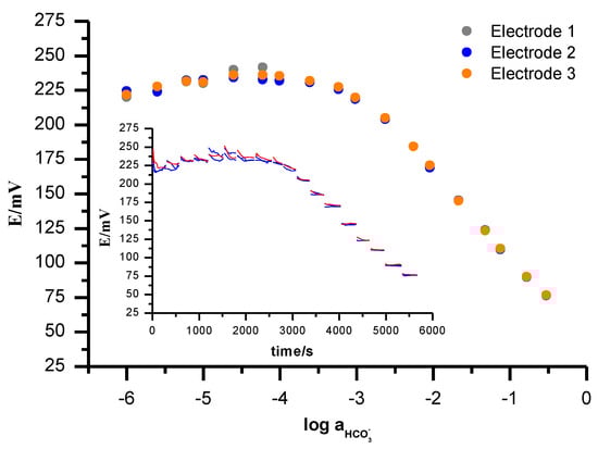 Potentiometric calibration curve and potential change over time (insert) of bicarbonate sensitive electrodes (n = 3) with a polymer matrix of divinylbenzene cross-linked polystyrene obtained during measurements in NaHCO3 solutions in the concentration range 10−6–5·10−1 mol L−1.