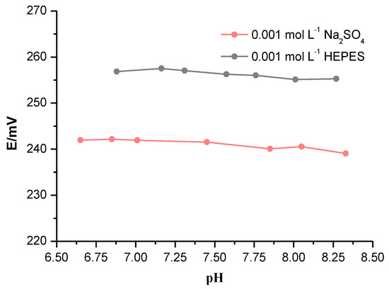 Short-term stability can be obtained from Figure 4. The drift E over time is 0.1 mV min−1 for the polystyrene anion exchanger membrane. During calibration, a fast stabilization time of the signal was observed after the change of the main ion concentration; the response time t90 is less than 5 s. These very good dynamic properties of the bicarbonate electrode are crucial for analytical application as described later below. The lifetime of this electrode was about 2 months. During this time, the slope of the bicarbonate-sensitive electrode remained approximately stable. The effect of pH on electrode response in the pH range from 6.9 to 8.2 was purposely investigated. This range was dictated by practical application since it covers the pH range in the samples we used. The potential changes were measured in (a) 0.001 mol L−1 Na2SO4, (b) HEPES solutions at 0.001 mol L−1. The pH was changed by adding NaOH solution. The electrodes with a polystyrene membrane are not sensitive to pH change, as shown in Figure 5.
