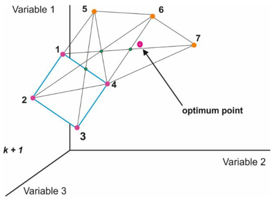 Example of the displacement of initial simplex to the region of optimum response of three variables.