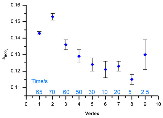 Figure 6 shows the simplex method with regard to the optimization of three variables through the displacement of the initial simplex represented by the geometric figure. First, in order to optimize the measurement time, the calibration was carried out in sodium bicarbonate solutions and then in the sample containing interfering ions (chlorides) at different time periods, starting at 65 s for a readout time and decreasing to 2.5 s. Calibration was carried out in solutions with the following concentrations: 10−3, 5 × 10−3, 10−2, 5 × 10−2, 10−1 mol L−1 NaHCO3, and in the sample of 25 mmol L−1 NaHCO3 and 0.1 mol L−1 NaCl which was used to estimate deviation from the target bicarbonate sample concentration, 25 mmol L−1 and corresponding activity 19.5. The measured apparent activity of bicarbonate ions in the sample was calculated using Equation (1) for S = 58,3 mV/ and K = 3. Although still far the target the closest, and reproducible (n = 3) readout was found after 5 s (Figure 7). Error bars are standard deviations obtained for measurements with three bicarbonate ion-selective electrodes.