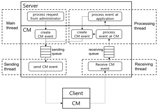 CM [1] is a communication framework for developing distributed applications. Using the API and configuration files provided by CM, an application developer can easily implement various communication functions that enable the application to interact with other CM nodes (applications that use CM communication services). Using CM communication services, a CM node can distinguish roles from client to server. The CM client node can easily interact with the CM server node with basic communication functions such as registration, connection, login, CM event creation and transmission, CM event reception and processing, etc. In addition, the CM node can use services such as file transfer, SNS content management, diagnosis of the current network status, and communication channel management. All CM services used by the client are configured in a request–response pattern. When a client requests a service, the client CM creates the request event and sends it to the server. When the server performs the requested service, the server CM creates a response event and sends it back to the client.