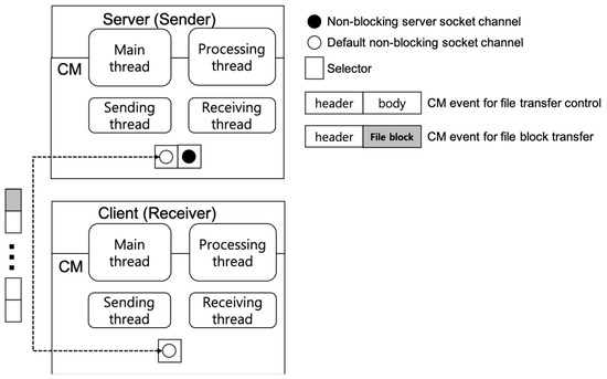 Figure 2 shows the concept of the non-blocking method. The non-blocking socket channel, which is the default communication channel of CM, is the channel that CM clients use by default when connecting to the CM server. The non-blocking channel is registered in the selector object of CM, and the CM receiving thread detects and receives a CM event delivered asynchronously by monitoring the selector object. Since all messages sent and received through the selector follow the CM event format, when CM receives a byte message over the channel, it converts the message into a CM event and processes it. When CM sends a message, it goes through the opposite process. Therefore, in order to transmit a file using the non-blocking channel, a file block cannot be transmitted as it is and must be converted to the CM event format. A CM event consists of two parts: an event header common to all events and an event body that has different payload according to an event type and identifier. As CM defines an event for the file block transfer, the file block can be included in the body part of this event and can be transmitted.