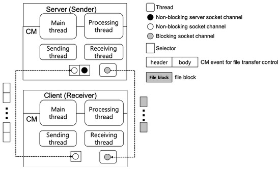 The File Transfer Protocol (FTP) is a representative standard protocol [4,5]. Most commercial file transfer clients and servers are implemented according to this standard specification for compatibility. In the file transfer procedure, the blocking method is similar to the FTP method in that the control message channel and the file data channel are separately managed. However, FTP does not describe the consideration of the channel type or the thread usage, which should be considered when implementing a file transfer process as a service of a communication framework rather than as an independent file transfer program.
