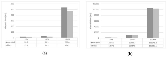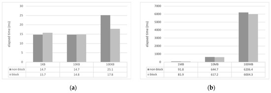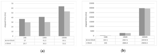The analysis results of the experiments of the file transfer time measurement are as follows. In general, regardless of the physical distance between the server and the client, the non-blocking method has a longer transmission time than the blocking method. This is because the non-blocking method has an additional cost when converting the file format to the CM event format. The transmission time difference of the two methods varies from several milliseconds to several hundreds of milliseconds depending on the size of the file used in the experiment. When transferring small files as small as 10 KB, the difference between the two methods is only a few milliseconds. When transferring large files of 100 MB or more, there are differences of hundreds of milliseconds. That is, as the file size increases, the file transfer time does, too.