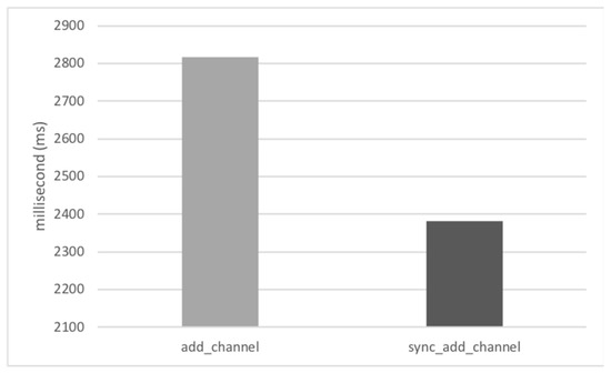 The blocking method shows shorter transfer times than the non-blocking method. However, this method requires the use of a separate communication channel rather than the CM’s basic channel for the file transfer. In this experiment, since the blocking channel was previously created and maintained when the client logged in to the server, the channel addition cost was not included in the file transfer time. If all clients create additional channels in advance for file transfer, the CM has a burden of managing twice as many channels as usual, which may be a problem for scalability of the system. If a blocking channel is added only when transmitting a file, like in most existing file transfer methods [4,5,6,7,8,9,10,11,12,13,14,15,16], including the well-known FTP, the channel management cost can be reduced, but the file transmission time is increased by the channel addition time. Figure 7 shows the result of measuring the time taken by the client to add socket channels and complete synchronization with the server. CM’s channel addition service can be used synchronously or asynchronously, and we measured the server response time for both cases. As shown in the figure, the channel addition is a high-cost operation that can take up to several seconds. In fact, the channel add-on time varies considerably from a few hundred milliseconds to a few seconds depending on the situation. As a result, if a channel is added when there is a file transfer request, the time required for the entire file transfer may be greatly increased, resulting in a slower file transfer performance than the non-blocking method.