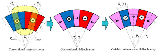 Structures of conventional and variable pole-arc ratio Halbach arrays.