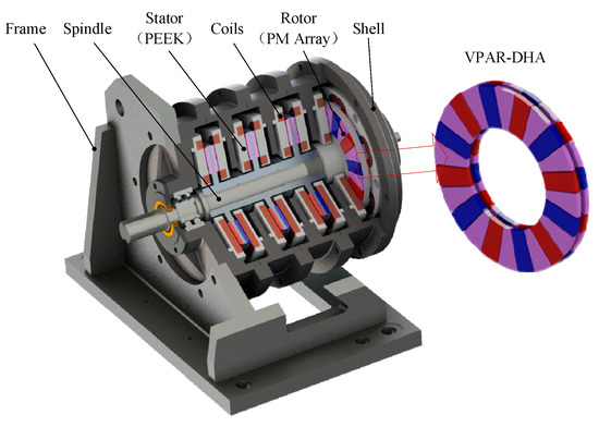 The torque output capability of a single DVCM is limited. To meet the various demands of the dynamic torsional stiffness test, a multi-module DVCM-EDE with VPAR-DHA structure was proposed. It is a multi-structure that contains a number of modularly designed moving-magnet-type DVCMs that provide distributed power to achieve high loads of torque-output capability, as shown in Figure 3.