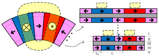 The Fourier series method is utilized to derive the divergence of and to solve the flux density distribution. The upper and lower Halbach arrays were divided into two sub-arrays, namely the axial magnetized sub-array, and the circumferential magnetized sub-array, as shown in Figure 5.