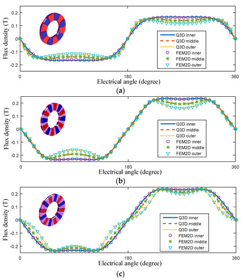 In order to verify the analytical Quasi-3-D model, the air-gap flux density was compared with the 2-D FEM results. The calculation results in the inner, middle, and outer slices for the conventional magnetic pole, the conventional Halbach array, and the VPAR-DHA are shown in Figure 6. The analytical and 2-D FEM results are in good agreement with each other. As shown in Figure 6d, the flux density distributions at the middle slice are compared for three configurations. Compared with the conventional magnetic pole and the conventional Halbach array, the air-gap magnetic field of the VPAR-DHA is enhanced remarkably. As the pole-arc ratio decreases with the increase of the radius, and the magnetic field enhancement ratio increases with the increase of the radius. Proportional to the radius, the output torque is enhanced significantly with the increase of the outer-ring magnetic field, while the high magnetic field area width decreases at the same time. Because the cross-section width of the coil does not change with the radius, the electrical angle corresponding to the working range decreases with the increase of the radius. The field intensity of the VPAR-DHA can be increased without affecting the working range.