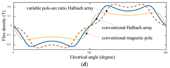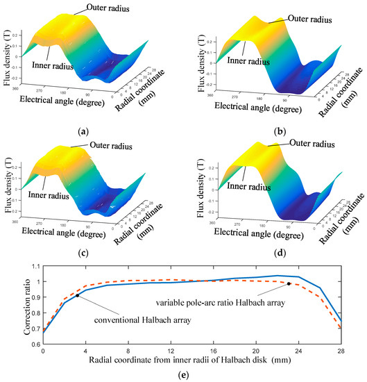 The correction functions of the conventional Halbach array and the VPAR-DHA are shown in Figure 8e. The drop can be seen near the inner and the outer radii. Compared with the conventional Halbach array, the correction ratio in the middle region for the VPAR-DHA is closer to 1, which means that the latter has a higher accuracy in analytical calculations.