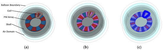 Obtained by simplifications, the Quasi-3-D method does not take the radial dependence end-effects on the magnetic field into account. For more reliable calculations, proper modeling corrections must be carried out [16,17]. Thus, a 3-D FEM model of the DVCM was built with respect to the analytical results of the quasi-3-D model, with the help of finite-element software ANSOFT. As the DVCM provided in this paper is slotless and back-ironless, the 3-D FEM model was simplified with just the PM array, coils, shell and the air domain. In addition, the balloon boundary was chosen for both fast computation and accounting for the flux leakage effects. As the designed DVCM is an axisymmetric structure, the model was built with a single coil for simplification. The elements were generated with the intelligent tetrahedral meshing tool of ANSOFT, and the total number of elements in the model was up to 200,000. Conventional magnetic pole and conventional Halbach array models were also built for comparison, as shown in Figure 7.